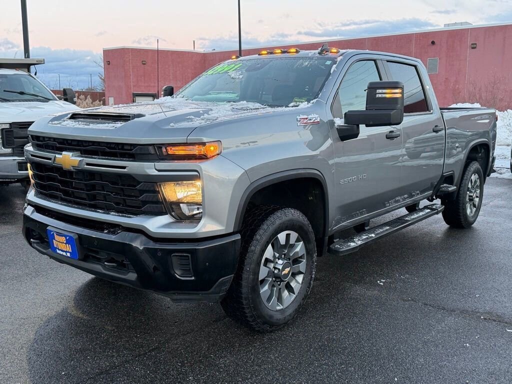 CARFAX One-Owner. Clean CARFAX. Sterling Gray Metallic 2025 Chevrolet Silverado 2500HD Custom VALUE PKG/Z71 OFF ROAD/PLOW PREP 4WD 10-Speed Automatic 6.6L V8 PRICE INCLUDES DEALER DOC FEE!, CLEAN CAR FAX REPORT, LOCAL TRADE, ONE OWNER, Silverado 2500HD Custom VALUE PKG/Z71 OFF ROAD/PLOW PREP, 4D Crew Cab, 6.6L V8, 10-Speed Automatic, 4WD, Sterling Gray Metallic, Jet Black w/Cloth Seat Trim, 10-Way Power Driver Seat Adjuster with Lumbar, 120-Volt Bed Mounted Power Outlet, 120-Volt Interior Power Outlet, 170 Amp Alternator, 2-Speed Electronic Shift Transfer Case, 3.5" Diagonal Monochromatic Display DIC, 3.73 Rear Axle Ratio, Auto-Dimming Inside Rear-View Mirror, Black Mirror Caps, Bluetooth® For Phone, Chevrolet Connected Access Capable, Color-Keyed Carpeting Floor Covering, Compass, Custom Convenience Package, Custom Value Package, CX Safety Package, Deep-Tinted Glass, Dual Rear USB Ports (charge Only), Durabed Pickup Bed, Electric Rear-Window Defogger, Electronic Cruise Control with Set and Resume Speed, EZ Lift Power Lock and Release Tailgate, Front Rubberized Vinyl Floor Mats, HD Rear Vision Camera, Heated and Auto-Dimming Vertical Trailering Mirrors, Heated Vertical Trailering Mirrors, Hill Descent Control, Lane Change Alert with Side Blind Zone Alert, LED Cargo Area Lighting, Locking Tailgate, Manual Tailgate Function with No EZ Lift, Manual Tilt-Wheel Steering Column, Off-Road Suspension, OnStar Services Capable, Power Door Locks, Power Front Windows with Driver Express Up/Down, Power Front Windows with Passenger Express Down, Power Rear Windows with Express Down, Preferred Equipment Group 1CX, Push Button Start, Rear 60/40 Folding Bench Seat (folds Up), Rear Cross Traffic Alert, Rear Rubberized Vinyl Floor Mats, Remote Keyless Entry, Remote Vehicle Starter System, SiriusXM with 360L Trial Subscription, Standard Tailgate, Suspension Package, Ultrasonic Front and Rear Park Assist, Unauthorized Entry Theft-Deterrent System, Wheels: 20" 10-Spoke Machined Aluminum, Wi-Fi Hotspot Capable, Wireless Phone Projection, Z71 Off-Road Package.